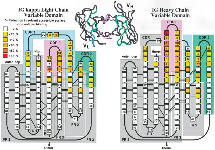 In the HuCAL GOLD library, the structural diversity of the human antibody repertoire is represented by seven heavy chain and seven light chain variable region genes, giving rise to 49 frameworks in the master library. Highly variable genetic cassettes (CDRs – Complementarity Determining Regions) are then superimposed on these frameworks to mimic the entire human antibody repertoire (Fig 1). More than 15 billion functional human antibody specificities in Fab format are already prefabricated and available in HuCAL phage libraries.